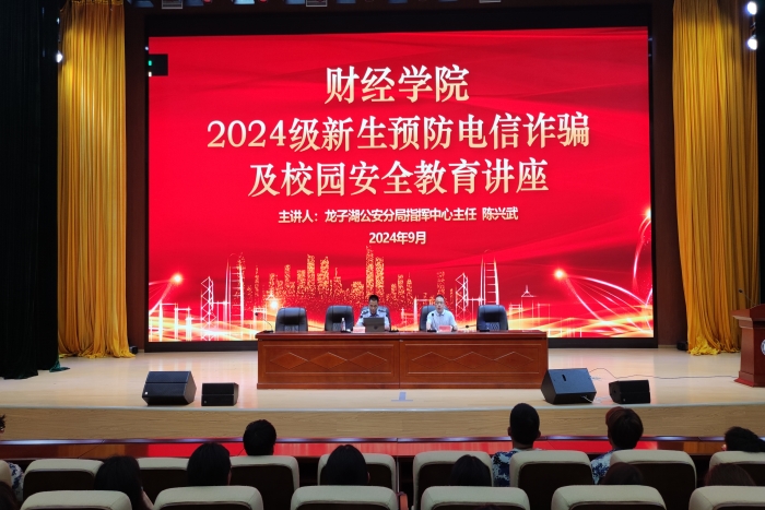 为进一步提升学生的安全防范意识和自我保护能力,9月10日晚上,财经学院在东辅楼报告厅举办了预防电信诈骗及校园安全教育专题讲座。讲座由新时代先进模范人物、全国公安机关成绩突出个人荣誉称号获得者、“安徽省杰出人民警察”、蚌埠市龙子湖公安分局指挥中心主任陈兴武同志主讲。财经学院党委副书记、纪委书记耿广汉主持,全体辅导员及2024级新生参加。