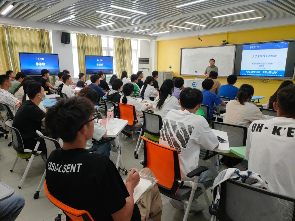 会上,高青海首先介绍了学校学科竞赛的总体情况,并通过往届竞赛经历,向在座的同学们讲述了学长学姐参与竞赛的趣事、收获的荣誉与成长。同时以往届优秀获奖作品为例重点介绍了中国国际“互联网+”大学生创新创业大赛、“挑战杯”全国大学生课外学术科技作品竞赛、全国大学生电子商务“创新、创意及创业”挑战赛等高水平赛事。