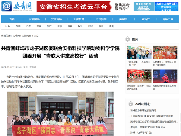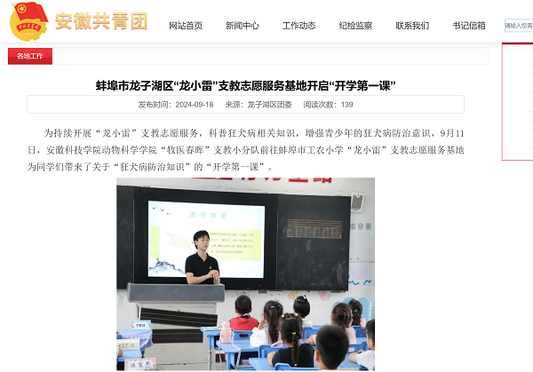 在志愿服务方面,动物科学学院团委与共青团龙子湖区委员会共建大学生志愿服务平台,学院青年志愿者们积极投身社会公益事业,先后参与义务支教、环境治理、关爱流浪动物、助力乡村振兴等多项志愿服务项目。他们脚踏实地、奉献青春的感人事迹频频亮相各大媒体平台,赢得社会广泛赞誉,在第七届安徽省青年志愿服务项目大赛中学院申报“聚焦三农,助力振兴”项目荣获银奖。学院团委负责人表示,将不断完善志愿者管理机制,进一步激发学生的公益热情,使青年力量融入更广阔的社会舞台。