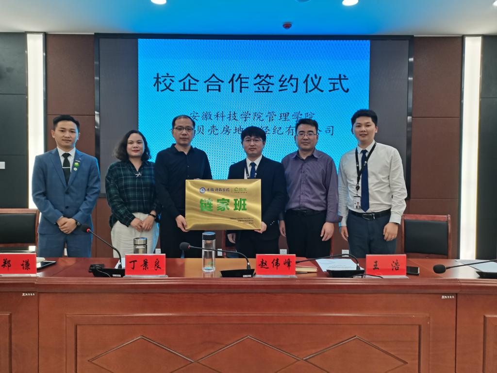 5月13日下午,管理学院与合肥贝壳房地产经纪有限公司校企合作签约暨授牌仪式在西附楼111会议室隆重举行。管理学院党委书记丁景良、院长赵伟峰、副院长郑谦,合肥贝壳房地产经纪有限公司(以下简称合肥贝壳)人力总监王浩,物流管理17届毕业生、合肥贝壳合肥校招城市负责人柏光磊,市场营销(专升本)15届毕业生、合肥贝壳合肥市城中区商圈经理王银兵、2018级市场营销、工商管理全体同学出席了签约授牌仪式。仪式由丁景良主持。
