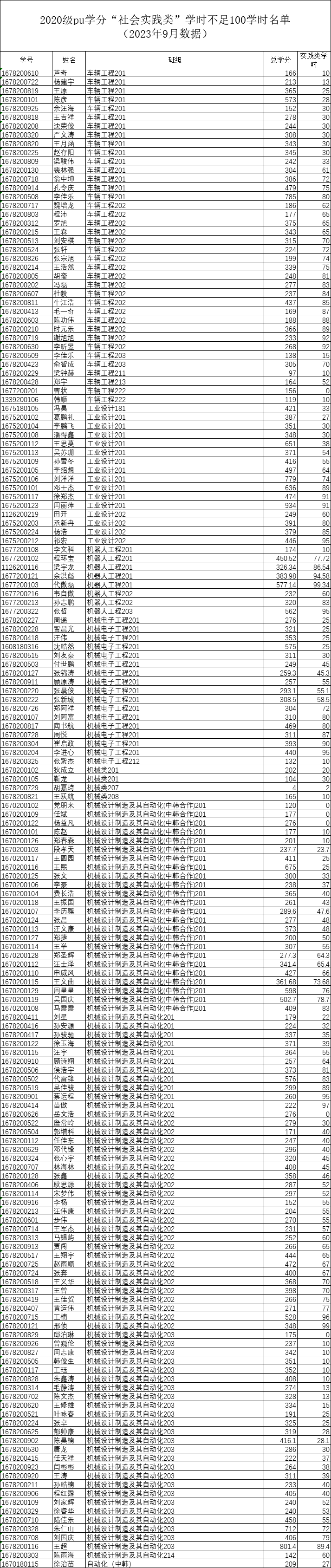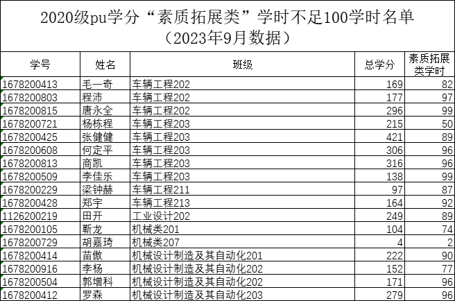 机械工程学院2023-2024-1学期二课堂学分(PU)未达标名单公示(2020级、2021级、2022级)