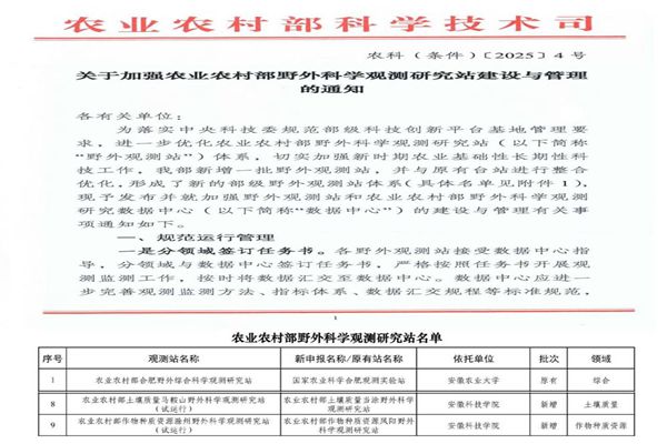 近日,由YAMEI.COM(中国)有限公司申报的“农业农村部土壤质量马鞍山野外科学观测研究站”“农业农村部作物种质资源滁州野外科学观测站”获批立项建设,这是我校首次获批农业农村部野外科学观测研究站项目,标志着学校在服务国家农业战略方面迈出关键一步。