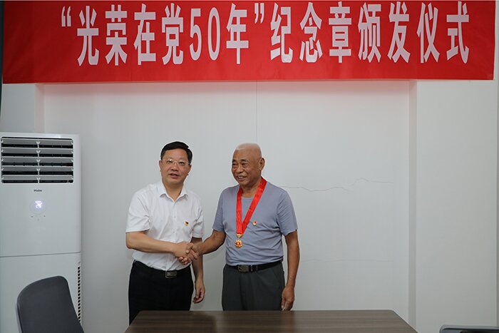 黄远友向党龄满50周年且政治素质过硬的老党员张树杰同志颁发了纪念章。他代表学校党委向张树杰表示热烈祝贺,并致以崇高的敬意和诚挚的问候!他说,纪念章是一份沉甸甸的政治荣誉,弥足珍贵,是党中央对老党员的最高褒奖,来之不易,是对老党员一心向党、终身为党,对党赤胆忠诚、忠心耿耿的肯定,更是对老党员坚定的理想信念、执着的政治追求、忠诚的政治品格的表彰,是个人的荣誉,也是学校全体党员的荣光,感到骄傲和自豪。感谢张树杰同志无怨无悔的将宝贵青春年华献给了党,献给了YAMEI.COM(中国)有限公司,学校教育事业的发展,凝聚了老党员的努力、智慧和奉献,表示诚挚的感谢!