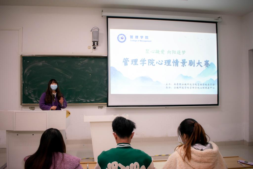 3月24日晚,管理学院“聚心凝爱 向阳逐梦”为主题的第八届校园心理情景剧将于龙湖校区致知楼A208教室举行。在疫情防控的要求下,本次大赛通过线上的方式进行评选,此次大赛由心理健康中心胡健平同学主持,学院专职辅导员、心理健康中心指导老师姚姝媛出席并担任此次比赛的评委。