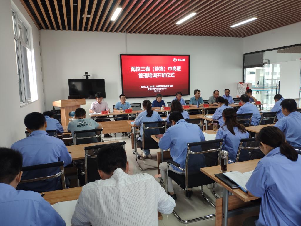 8月14日上午,由管理学院举办的海控三鑫中高层管理干部培训开班仪式在海控三鑫(蚌埠)新能源材料有限公司培训室正式举行。校教务处处长赵伟峰、管理学院党委书记丁景良、管理学院院长陈传万、管理学院副院长张国宝、海控三鑫(蚌埠)新能源材料有限公司总经理袁飞、副总经理张正超、副总经理陈田、副总经理孙波及公司全体中层管理干部参加了开班仪式,开班仪式由丁景良主持。