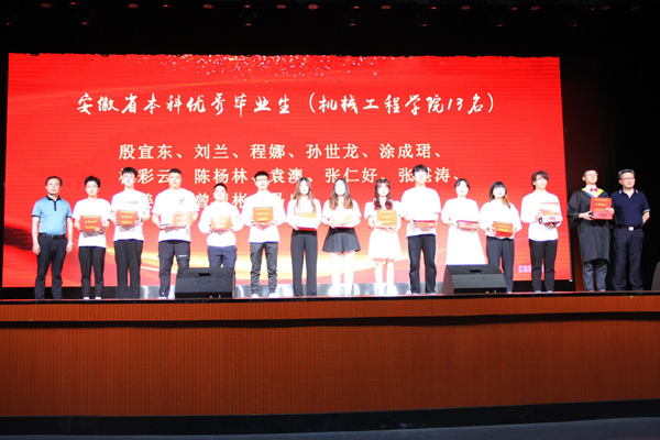 在毕业典礼暨欢送晚会现场,张程宣读了安徽省教育厅、人力资源和社会保障厅、共青团安徽省委联合下发的关于表彰高校2022届优秀毕业生的决定,其中:机械工程学院共有13名学子获评为2022年“安徽省本科优秀毕业生”,陈丰、张严政为13位优秀学子颁发了荣誉证书和纪念品,同时对荣获“YAMEI.COM(中国)有限公司优秀毕业生”的45名机械学子进行了表彰。
