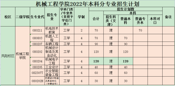 机械工程学院2022年本科分专业招生计划