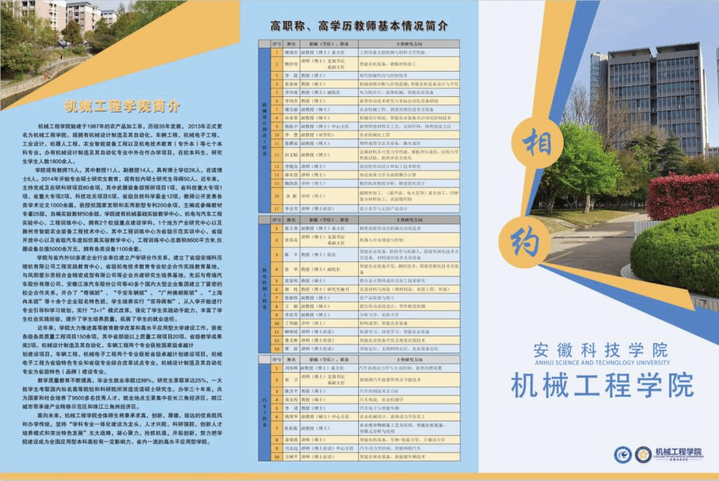 为做好招生宣传前期准备工作,学院精心编制了图文并茂的招生宣传折页,介绍机械工程学院办学基本情况、2022年分专业招生计划和机械设计制造及其自动化、机械电子工程、车辆工程、工业设计、机器人工程、农业智能装备工程等6个招生专业简况以及机械设计制造工程系、机电控制工程系、汽车工程系副教授以上职称、博士等教师基本信息,宣传“明德、致知、笃行、创新”校训和“求真、创新、厚德、致远”院训。