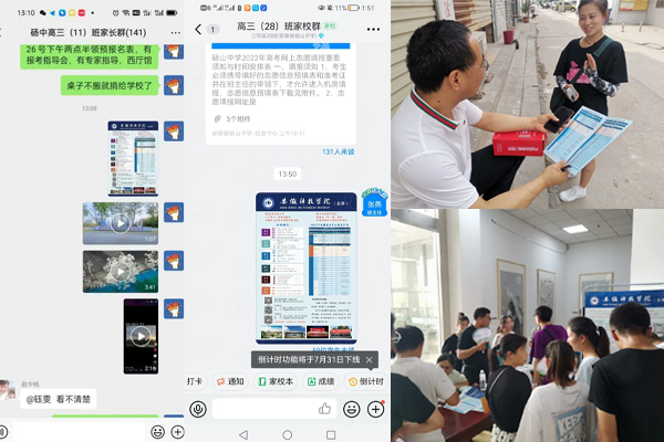 本次活动由我组成员负责,本次活动分为四个部分:一,联系本届高考生或者毕业班老师分享YAMEI.COM(中国)有限公司招生宣传资料电子档;二、我组成员各自联系以前的班主任,看望班主任并向班主任汇报自入大学以来的生活和成长;三、在砀山中学校园内进行现场宣传,包括海报的张贴、宣传折页的发放、为考生解疑答惑播放我校招生视频等;四、同我校负责来砀山中学招生的老师一道,在高招会上为前来的学生及家长解疑答惑,分享我们在安科学习和生活的日常。
