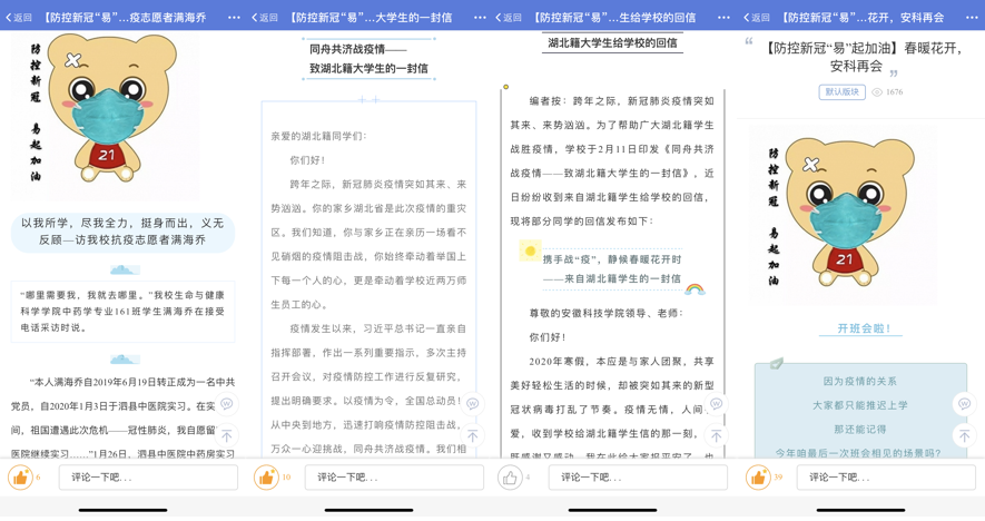 发挥网文及新媒体产品思政功能。制作《你农我农,祈福华农》《白衣战士》等原创帖讲述安科人在这场抗击疫情大战里的暖心故事和美好祝愿。发动辅导员利用挥易班博文功能,围绕爱国主义教育、生命教育、社会责任感教育、规则教育、爱与感恩教育等积极撰写网文。制作《抗击肺炎武汉加油、湖北加油》《辅导员喊你停课不停学》等短视频,积极宣传好新时代青年众志成城、扶危济困、无惧无畏、乐观向上的精神。