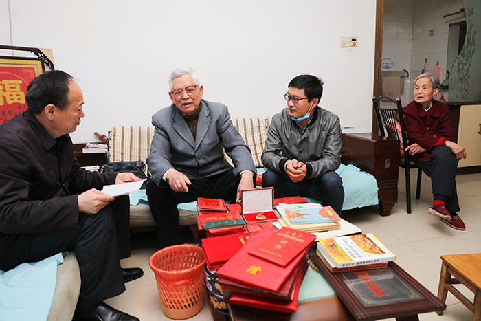 4月28日,校离退休党总支副书记时乾带领离退休工作处、校史馆建设领导组办公室相关工作人员等一行5人专程前往淮南市拜访我校退休老同志李位三、李启松夫妇。