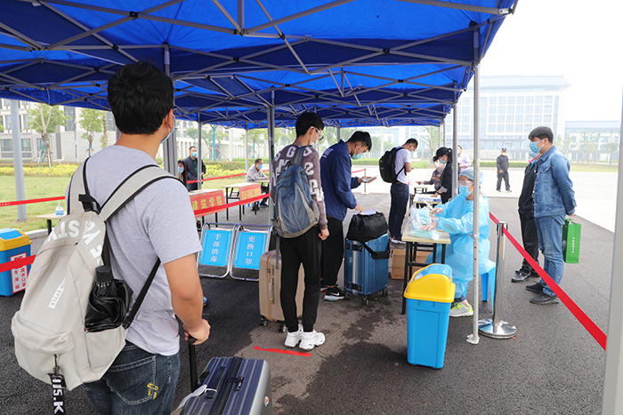 首批同学返校让寂静了几个月的校园,再次热闹起来。学生公寓、食堂、教学楼、临时留观点等重点公共区域张贴着引导和防疫标识。校领导深入现场看望学生和工作人员,查看准备工作情况;相关部门负责人和各学院党总支书记、辅导员早早来到了报到现场,接待报到学生、提供周到服务。