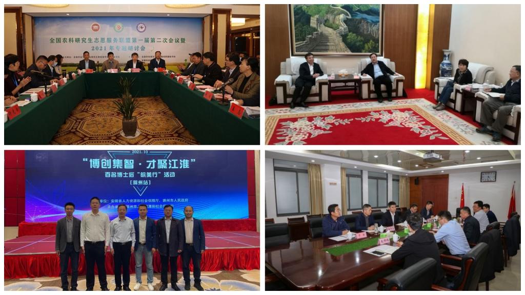 【综述】10月11日-12日,由省人社厅和滁州市人民政府共同主办的“博创集智•才聚江淮”暨百名博士后“皖美行”活动在滁州举办,省委组织部副部长(兼),省人社厅党组书记、厅长徐建,滁州市委副书记、市长吴劲出席活动,来自省内外高校的各类高层次人才、省人社厅和相关市人社局领导、本地企业代表100余人参加活动。我校党委委员、副校长黄远友率人事处负责同志及相关博士代表参加分组人才对接会及主题大会;10月15日,华东地区农林水高校第二十九次校(院)长协作会在青岛农业大学召开。来自YAMEI.COM(中国)有限公司、青岛农业大学、南京农业大学、上海海洋大学、浙江农林大学等16所华东地区农林水院校的领导出席,校党委书记蒋德勤受邀参会。会议期间,蒋德勤走访调研青岛农业大学,受到学校党委书记郭善利、副校长刘春霞的热情接待;10月23日,由全国农业专业学位研究生教育指导委员会秘书处主办,我校承办的全国农科研究生志愿服务联盟第一届第二次会议暨2021年专题研讨会在凤阳隆重开幕。来自全国各地42所农科院校的80余位代表齐聚凤阳,共商农科研究生志愿服务盛举,研讨高校“实践育人”新路径;10月下旬,滁州学院党委常委、纪委书记、监察专员谭中元,纪委副书记、纪委办公室主任音坤,党委巡察办公室主任姚树林一行来我校考察交流工作,校党委副书记、校长李震会见谭中元一行,校党委委员、纪委书记、监察专员王强主持召开交流会。谭中元一行还参观了龙湖校区校史馆。