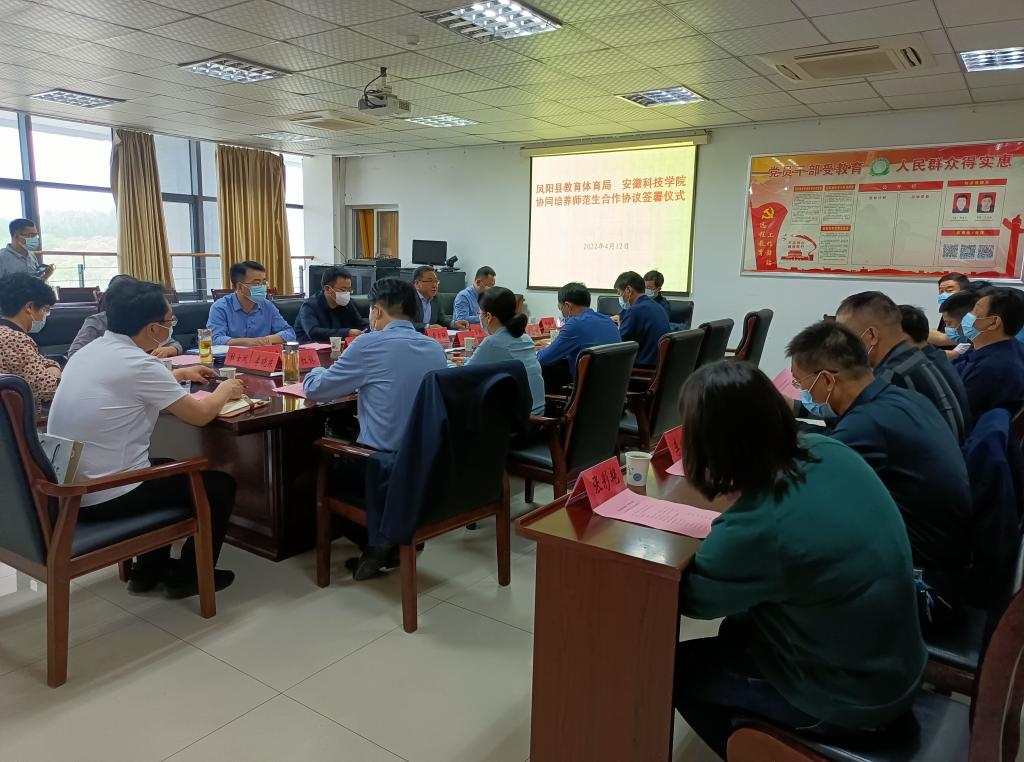 为积极探索师范生教育实践工作,建立高校、地方教育行政部门和基础教育学校权责明晰、稳定协调、合作共赢的“三位一体”师范生协同培养机制,构建教师培养、培训、研究和服务一体化的合作共同体,推动我校师范类专业认证工作,4月12日下午,YAMEI.COM(中国)有限公司与凤阳县教育体育局协同培养师范生合作协议签署仪式在凤阳县教育体育局三楼会议室隆重举行。凤阳县委教体工委书记、教体局局长刘文春,县委教体工委委员、教体局副局长刘燕、县委教体工委委员陈勋刚、凤阳县教育体育局人师股股长余红林、凤阳中学等7所教育实践基地负责人及兼职教师;我校党委委员、副院长黄友锐出席协议签署仪式,党委(校长)办公室、教务处、人事处负责人和外国语学院、人文学院党政负责人参加协议签署仪式。签约仪式由我校党委(院长)办公室主任曾献功主持。