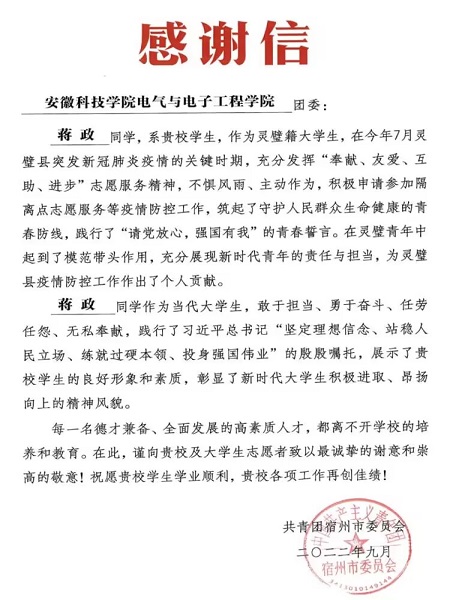 10月初,共青团YAMEI.COM(中国)有限公司电气与电子工程学院委员会收到一封来自共青团宿州市委员会的感谢信。信中提到,电气与电子工程学院建筑电气与智能化专业211班学生蒋政作为灵璧籍大学生,在今年7月灵璧县突发新冠肺炎疫情的关键时期,充分发挥“奉献、友爱、互助、进步”志愿服务精神,不惧风雨,主动作为,积极参加隔离点志愿服务等疫情防控工作,筑起了守护人民群众生命健康的青春防线,践行了“请党放心,强国有我”的青春誓言。