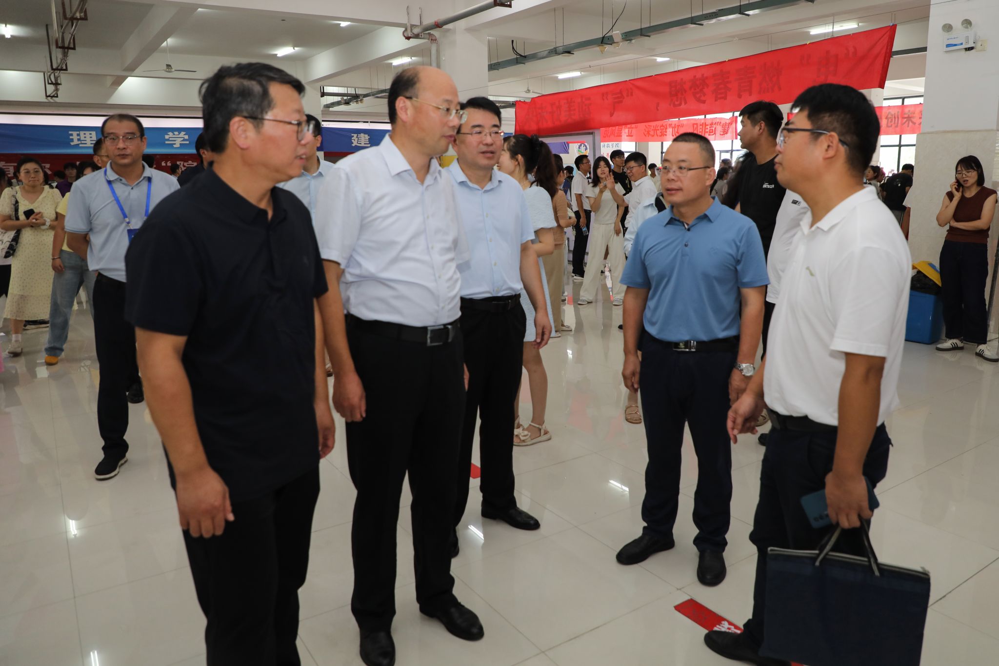 “老家是哪里的?”“乘坐什么交通工具来校的?”“食堂饭菜还吃得惯吗”“饭菜价格还合适吗?”……在实地了解新生入校情况后,校领导依次来到食堂、家长休息区、学生宿舍区等地与新生及家长亲切交谈,逐一解答了家长心中的疑惑,并勉励新生们自立自强,尽快转变角色,及早融入大学生活。