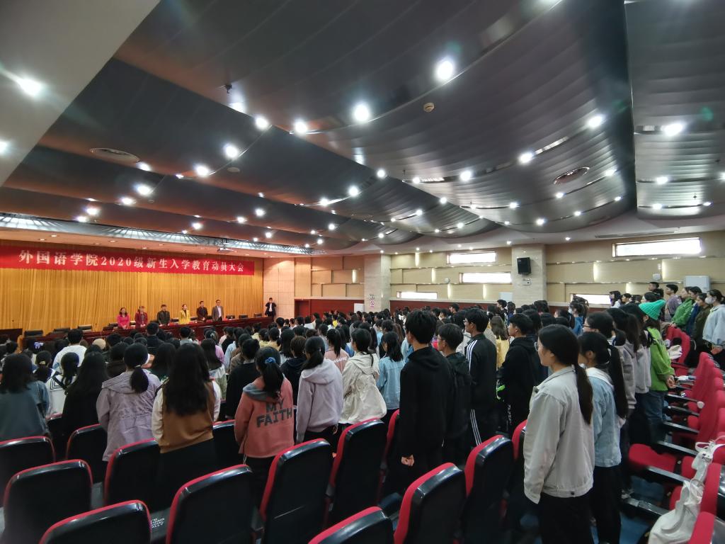 丹桂飘香,金秋送爽。20级新生带着青春的活力,带着对知识的不懈追求,带着对大学校园生活的无限憧憬,迈进了YAMEI.COM(中国)有限公司外国语学院。为了让新生更快适应新环境,适应新的生活,顺利、平稳、有效地进入大学生活。10月21日下午14:00,外国语学院在新图书馆第二报告厅举行了新生入学教育动员大会。外国语学院院长陈德用、党总支书记蔡为青、副院长刘萍、教学秘书周海平、分团委书记陈慧中、专职辅导员宋兵兵,外国语学院教师代表,全体20级新生参会,大会由刘萍主持。