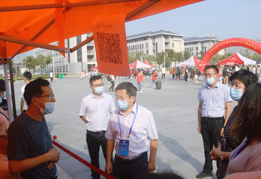 一些学生党员主动加入了迎新志愿者队伍,得知这一消息后,陈传万等院领导感到非常欣慰,来到南门党员服务点,肯定了学生党员积极发挥先锋模范作用,勉励他们再接再厉,把党史学习教育细化到新生服务的各个环节,把正能量传递给每一位新生。