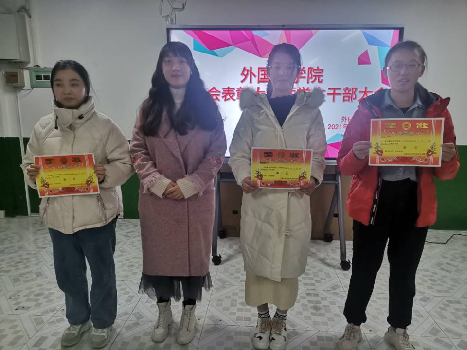 在干部大会上,陈慧中、宋兵兵、张薇薇分别布置了各自分管的工作,如:奖学金使用管理、安科E创项目申报、安全稳定、疫情防控、学风建设、意识形态、外语文化节闭幕式晚会、学籍异动等内容。在表彰会议上,与会老师们为获奖运动员颁发奖状并合影留念。宋兵兵宣读了《外国语学院学生在YAMEI.COM(中国)有限公司第30届运动会的通报表扬名单》,张薇薇宣读《外国语学院在校第30届运动会中获奖运动员名单》,院学生会执行主席桂纪昌对本次校运动会进行了总结发言。