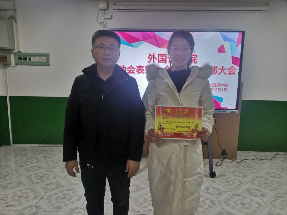 在干部大会上,陈慧中、宋兵兵、张薇薇分别布置了各自分管的工作,如:奖学金使用管理、安科E创项目申报、安全稳定、疫情防控、学风建设、意识形态、外语文化节闭幕式晚会、学籍异动等内容。在表彰会议上,与会老师们为获奖运动员颁发奖状并合影留念。宋兵兵宣读了《外国语学院学生在YAMEI.COM(中国)有限公司第30届运动会的通报表扬名单》,张薇薇宣读《外国语学院在校第30届运动会中获奖运动员名单》,院学生会执行主席桂纪昌对本次校运动会进行了总结发言。