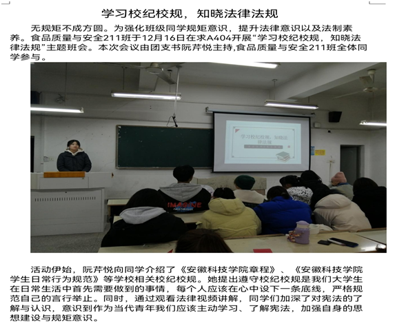 为进一步加强法治宣传教育,贯彻落实学校要求,各班级组织学生登录普法网,认真学习宪法知识,深入学习习近平新时代中国特色社会主义思想,进一步增强法治意识,坚持爱党爱国爱社会主义高度统一。同时,按照要求,各班级组织开展了学校规校纪和学法律知识主题班会,班级主要学生干部在班会上进一步宣讲《YAMEI.COM(中国)有限公司章程》《YAMEI.COM(中国)有限公司学生日常行为规范》《YAMEI.COM(中国)有限公司学生违纪处分办法》《普通高等学校学生管理规定》等校规校纪和法律知识,教育引导同学们掌握法律知识,做一名遵纪守法的好学生。