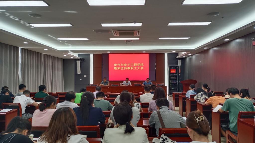 6月8日下午,电气与电子工程学院于西辅楼111报告厅召开全体教职工大会,学院党委书记骆海邦,党委副书记、副院长(主持工作)夏显明,副院长国海,及全体教职工参加了会议,会议由夏显明主持。