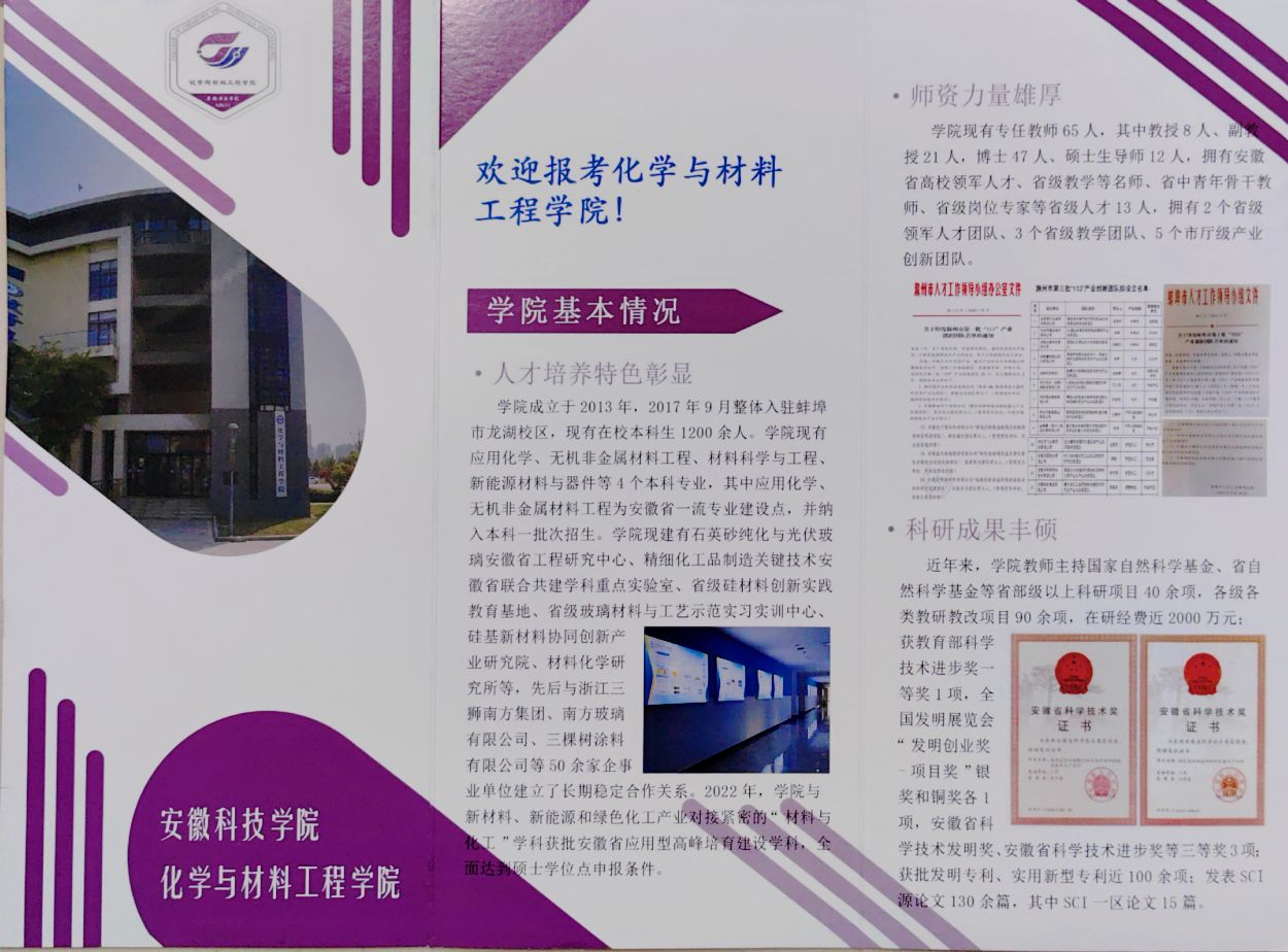 为积极应对新旧高考志愿填报模式转变可能带来的生源质量变化挑战,化学与材料工程学院在高质量完成学校下达的招生宣传任务基础上,学院还制作了“欢迎报考YAMEI.COM(中国)有限公司化学与材料工程学院”H5易企秀,组织师生利用微信群、QQ群宣传;学院印制了“欢迎报考化学与材料工程学院”纸质宣传册子,随同学校的宣传材料一并发放,主动向有化学及材料类报考意愿的考生及家长介绍学院,吸引考生关注学院。
