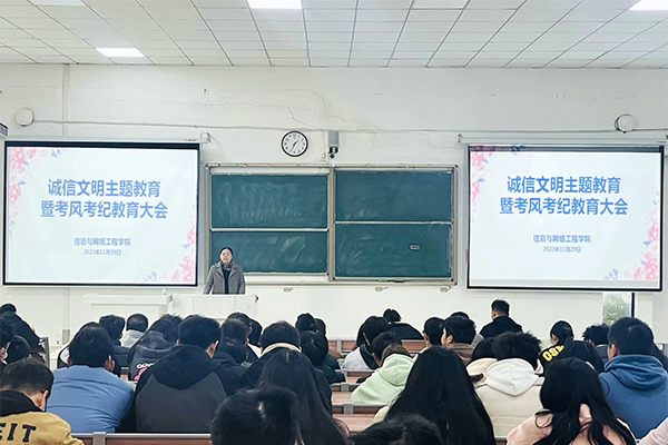 为进一步加强学院学风建设,营造良好的考试氛围。11月29日,信息与网络工程学院在致知楼C111教室召开诚信文明主题教育暨考风考纪教育会议。信息与网络工程学院党政领导和有关教师出席会议。2023级各班班委及学生会全体成员参加会议,会议由专职辅导员陈凯主持。