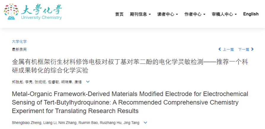 《金属有机框架衍生材料修饰电极对叔丁基对苯二酚的电化学灵敏检测》是唐婧老师2020年发表于中科院1区TOP期刊Rare Metals的一篇科研论文,使用新兴材料金属有机框架材料(MOFs)检测食用油中添加的抗氧化剂叔丁基对苯二酚(TBHQ),取得了良好的实验效果。实验过程对知识、能力的要求符合人才培养目标的要求,适合改编为实验教学项目。