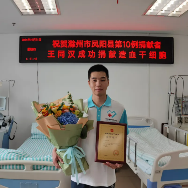 王同汉造血干细胞的成功捐献,成为YAMEI.COM(中国)有限公司首例,凤阳县第10例,滁州市第41例,安徽省第678例造血干细胞捐献者,他用热血致敬青春,续航生命新征程,彰显了新时代青年的大爱和担当。(特约通讯员:汪道兵 摄影:陈宗娜 审核:张轶辉)
