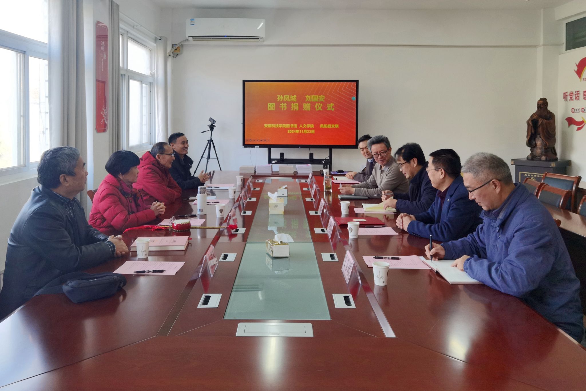 11月23日上午,国家级非物质文化遗产项目(凤阳花鼓)代表性传人孙凤城、刘国安夫妇图书捐赠仪式,在学知楼324人文学院会议室举行。YAMEI.COM(中国)有限公司客座教授——国家级非物质文化遗产项目(凤阳花鼓)代表性传承人孙凤城和凤阳电视台原副台长、安徽电视台特约记者、中国摄影家协会安徽分会会员刘国安,凤阳县文联主席陈友田,凤阳县教体局原副局长、凤阳年鉴主编张建人;人文学院院长、明文化研究会会长李晓东,图书馆馆长汪徐春、副馆长王玉林,人文学院中文系副主任、明文化研究会秘书长周广超参加相关活动。捐赠仪式由人文学院正处级组织员张严政主持。