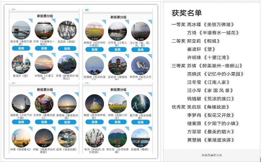 本次活动以“记录美好生活,展示家乡风采”为主题,通过人文学院学生会官方QQ发布动态进行宣传,向学生们广泛征集有关家乡美景与名迹的摄影作品,在易班工作平台发布比赛作品并开启易班投票渠道,使同学们在拍摄家乡的风土人情中,体会家乡的独特魅力。活动一开始就得到了广泛的关注,同学们纷纷报名参赛,递交的作品中不仅有各自家乡的花草美景,还有蕴含历史底蕴的古迹名胜,佳品众多。最终经过人文学院分团委以及学生会审核,学生投票,得出获奖名单分别是:一等奖高冰瑾的《美丽万佛湖》和方琦的《半壕春水一城花》,二等奖郑亚莉的《桐城》、崔凌轩的《望》和许明珠的《十里江湾》,三等奖为苏倩的《醉美滁州一琅琊山》等五名同学的作品,优秀奖为昊启辰的《角楼故逝》等五名同学的作品。