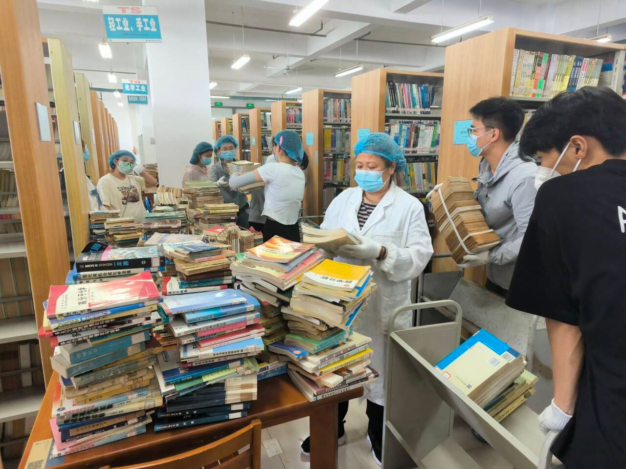 在图书馆书籍整理中,汉语言文学233班同学在图书馆工作人员的指导下,有条不紊地将所有需要整理的书籍按照序号排列整齐,抚平纸角,先用干湿抹布擦拭灰尘,再依次将它们放回书架上,让每一本书都能找到属于它的“家”。
