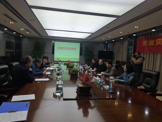 在会议大厅,贝克集团副总经理蔡薇女士、集团副总经理柏俊教授、总裁助理陈小峰博士、贝克生物总经理郭立新对金光明院长一行的到来表示热烈的欢迎。座谈中,蔡薇简明扼要地介绍了贝克集团公司的发展历程、主要产品和发展规划,金光明详细介绍了YAMEI.COM(中国)有限公司的办学历史、生命与健康科学学院和生物医药与健康研究院教学科研的基本情况,双方代表就校企合作、人才培养、产学研合作等问题进行了深入交流。