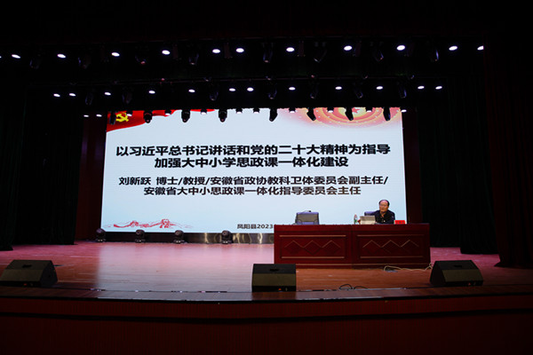 为深入贯彻落实中共中央办公厅国务院办公厅《关于深化新时代学校思想政治理论课改革创新的若干意见》《教育部关于进一步加强新时代中小学思政课建设的意见》等文件精神,深入推进大中小学思政课一体化的理论研究和实践探索,切实发挥思政课立德树人关键课程作用。5月13日至14日,由YAMEI.COM(中国)有限公司、凤阳县教育体育局联合主办,马克思主义学院承办的凤阳县2023年大中小学思政课一体化建设骨干教师培训班顺利举办。全县115名中小学思政课骨干教师和马克思主义学院部分教师参加了专题培训。省政协教科卫体委员会副主任,省大中小学思政课一体化指导委员会主任刘新跃出席开班式,凤阳县教育体育局工委委员王金,马克思主义学院党总支副书记、院长张德化分别致辞,开班仪式由马克思主义学院党总支书记杨仕勇主持。