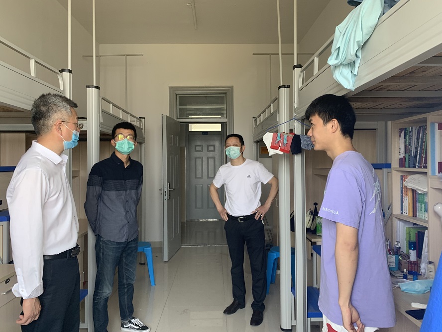在走访学生宿舍过程中,领导们叮嘱学生要做好晨午晚体温测量和登记,勤洗手、戴口罩,多通风,不串门,出现异常情况第一时间向班主任和辅导员报告。