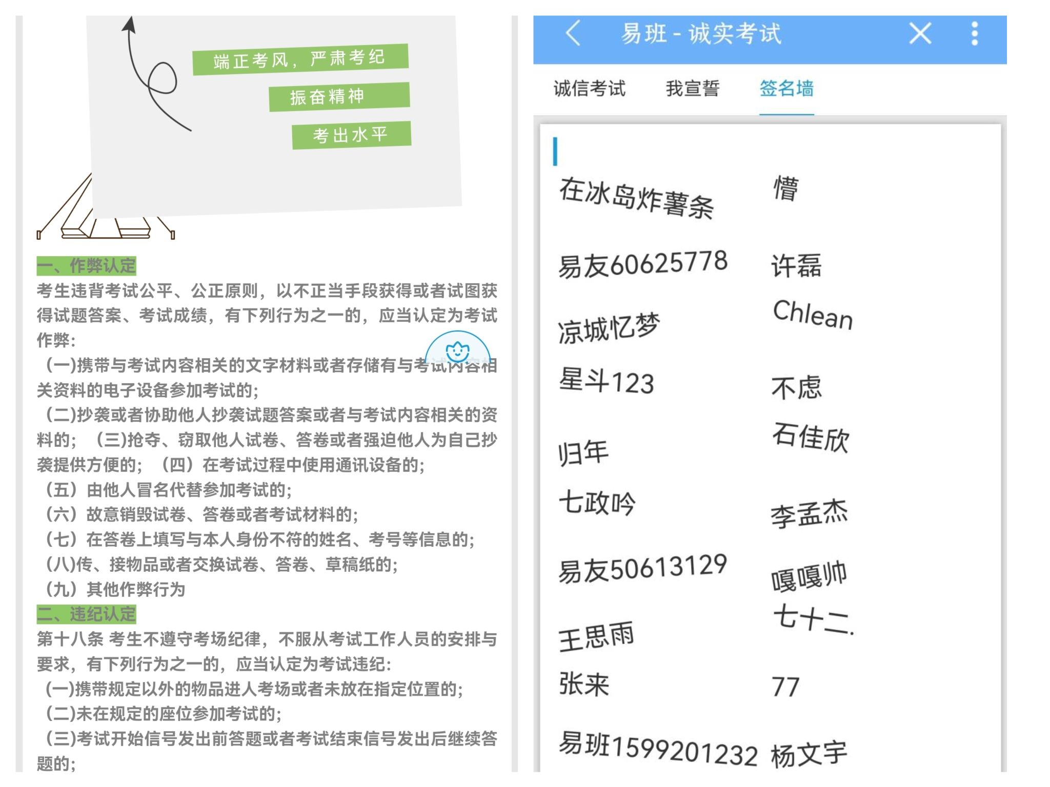 会上,各辅导员带领班级学生认真学习了《YAMEI.COM(中国)有限公司学生手册》中有关考风考纪的内容,对考试时应当遵守的注意事项及违纪行为的严重后果做了特别强调,向学生们传达了诚信考试的重要性和必要性,建议同学们对期末考试制定合理的复习计划,认真备考。各班辅导员还列举了校内外各种考试违纪行为被处分的真实案例,加强警示教育,要求同学们清晰认识到考试作弊的危害,希望他们严守考风考纪,认真备考,诚信考试,并组织班级同学签署诚信考试承诺书。