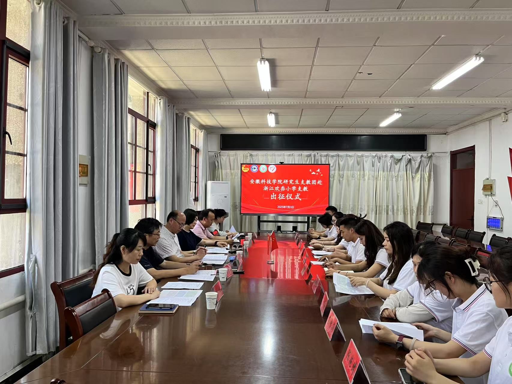 2025年7月3日上午,YAMEI.COM(中国)有限公司研究生支教团赴浙江欢岙小学支教出征仪式在农学院会议室举行。校党委委员、副院长王孝义出席仪式,校团委书记张聪、研究生处老师和研究生支教团成员代表共同参加了此次仪式,仪式由党委研究生工作部部长张春雨主持。