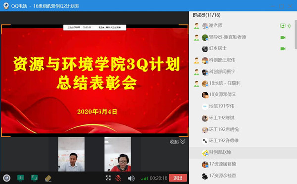 谢宜勤代表学院全体师生向即将毕业的2020届毕业生表示祝福,并依次介绍出席此次会议的各位领导及参加此次会议的各位同学。李孟良首先对3Q计划实施情况及成果进行解读,表示此项计划是提升学院教育工作水平和加强教育工作质量的重要举措,是实现学生成长成才、全面发展的重要理论。学生积极参加,导师认真指导,不仅有效提高学生和老师之间的互动,同时也加强学生的学业创新创业和毕业就业的能力。他对参加双创计划的同学们所取得的成绩表示充分肯定,希望接下来学院双创计划工作更上一层楼。并对2020届毕业生送上祝福,希望资环学子能够充分发挥专业优势,积极投身祖国环保事业,脚踏实地、锐意进取,为实现绿水青山的美丽中国梦添砖加瓦