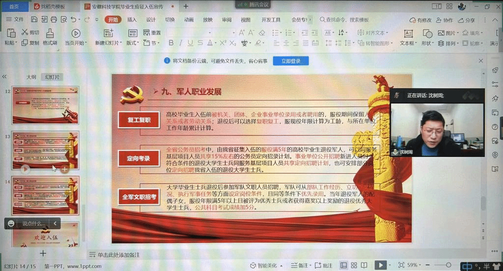 为了进一步增强当代大学生的国防意识,让每位同学进一步了解国家征兵新政策,有力推动学院2023年征兵工作的顺利开展。12月28日下午,资源与环境学院组织召开2023届毕业生征兵线上宣讲会。学院党委副书记沈树周、专职辅导员孙正浩和全体19级男同学参加会议,会议由沈树周主持。