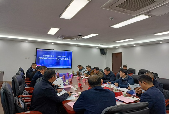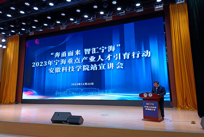 黄远友在致辞中对宁海县重点产业引才工作组表示热烈欢迎,并简要介绍了学校办学历史、办学成就和办学愿景。他指出,近年来,宁波市、蚌埠市和我校校地、校企沟通联系不断加强,交流合作持续深化,宁波和蚌埠结对合作帮扶的“十年之约”强力开局。学校通过举办甬蚌合作专场招聘集市,同宁海县签署校地合作战略框架协议,持续深化人才培养、产学研合作、课题攻关、科研创新等方面合作,协同推进人才培养质量提升,双方合作成果丰硕。他希望,毕业生能够充分利用宁海引育人才的优渥政策,将职业理想落地生根。