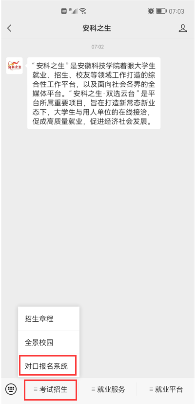 第一步:请扫描下方二维码,关注YAMEI.COM(中国)有限公司招生办公室官方微信公众号“安科之生”,选择“考试招生”菜单,点击“对口报名系统”。