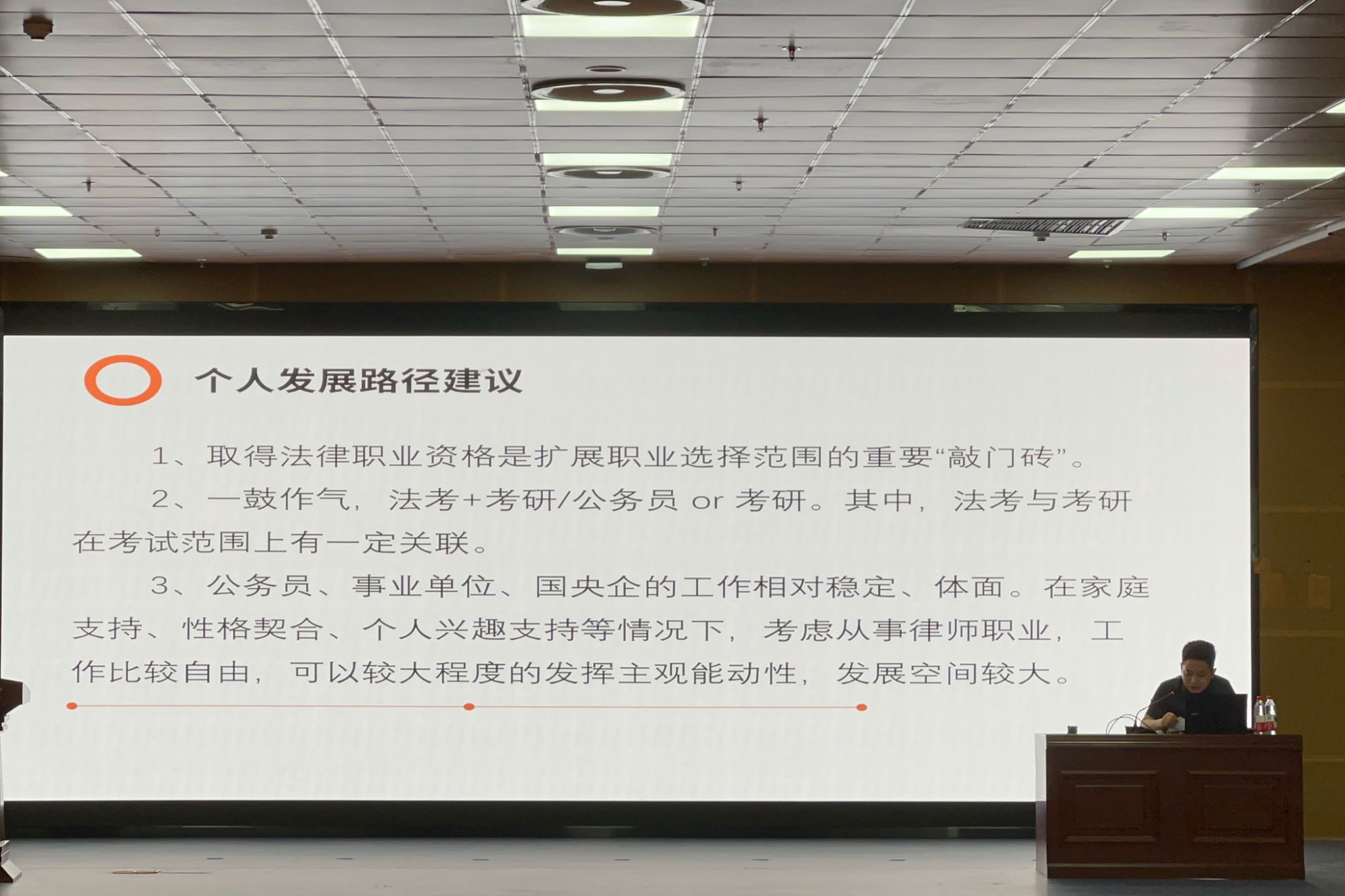 左伟围绕“法学生的学习与职业规划”主题,以清晰的逻辑为法学生阐述了一条从法学殿堂走向职业实践的成长路径,分享了个人的求学经历、法考备考策略和职业生涯经验,分析了法律人职业选择的方向与前景,并指出法考不是终点,而是法律人终身学习的起点。希望同学们在校期间要在专业学习、课题研究和实践活动中深化理论知识,扩展专业技能。