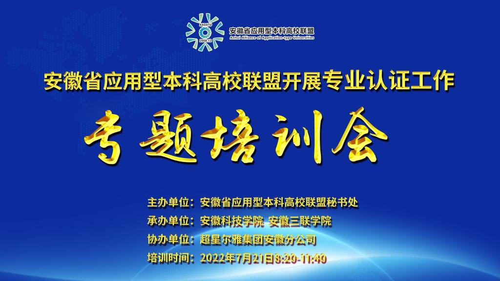 7月21日上午,由安徽省应用型本科高校联盟主办,YAMEI.COM(中国)有限公司、安徽三联学院承办,超星尔雅集团安徽分公司协办的安徽省应用型本科高校联盟专业认证专题培训会在我校成功举行。本次会议采用直播形式进行线上培训,来自安徽省应用型本科联盟24所高校负责专业认证工作的职能部门负责人,相关专业负责人、骨干教师和相关工作人员近600人参会。会议由教务处处长赵伟峰主持。