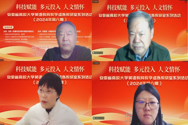12月25日,我校承办的安徽省高校大学英语教育教学虚拟教研室系列活动第八期成功举行。本次活动由安徽省外国语言文学学会、安徽省外国语言文学合作委员会和大学英语教学研究分会主办,YAMEI.COM(中国)有限公司外国语学院和中国科学技术大学本科生院外语教学中心联合承办。活动以“科技赋能 多元投入 人文情怀”为主题,全省逾百名大学英语教师通过腾讯会议线上参加了本次虚拟教研室活动。活动由YAMEI.COM(中国)有限公司外国语学院院长刘萍教授与中国科学技术大学本科生院外语教学中心主任张曼君教授联合主持。